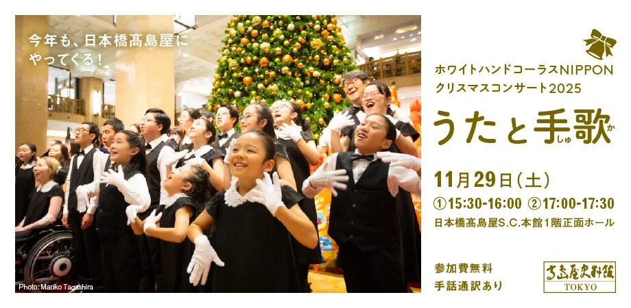 世界的に注目を集めるホワイトハンドコーラスNIPPONが、日本橋高島屋の正面ホールでクリスマスコンサートを開催するイベントです。聞こえる子も聞こえない子も、見える子も見えない子も、誰もが一緒に参加できるインクルーシブな合唱団で、声隊による歌声とサイン隊による白い手袋を使った“手歌”が響き合う唯一無二のステージが披露されます。クリスマス装飾が施された華やかな空間で、手話と音楽が溶け合う特別な時間が楽しめる内容となっています。